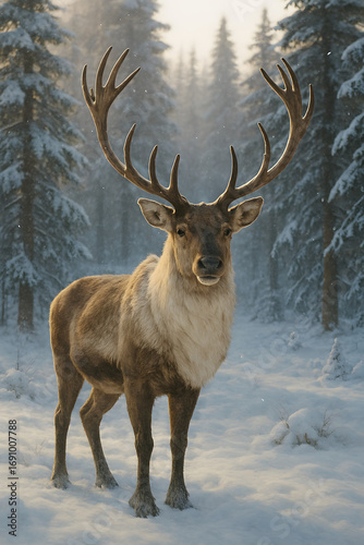 reindeer, cervid, antler, winter, snow, forest, pine tree, wood, majestic, wild, wildlife, animal, nature, peaceful, tranquil, realistic, photo, christmas, holiday, festive, season, cold, morning, sunlight, isolated