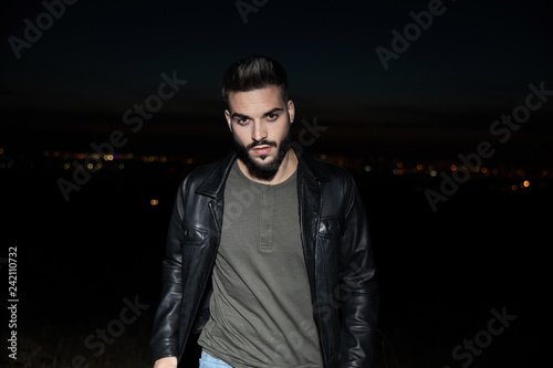 man, male, person, people, photogenic, attractive, sexy, young, unshaved, casual attire, happy, smile, look, hair, coiffure, model, field, grass, countryside, outside, racked, black, leather, jacket, jean, denim, grey, shirt, portrait, city, light, night, dark, background