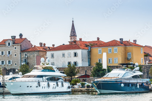 Marina for sailing yachts and boats overlooking the old town off the coast of Budva, Budva Riviera, Montenegro.