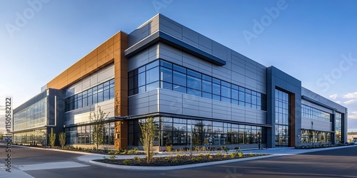 modern, architecture, building, rectangular, structure, facades, grey, white, panel, smooth, surface, glasses, window, sky, vegetation, green, plant, concrete, ground, paved, area, surrounding, landscape, high technology, modernization, design, aesthetic, top, roof, chinese, character, name, brand, part, impression, urban, scene, sleek, contemporary, innovation