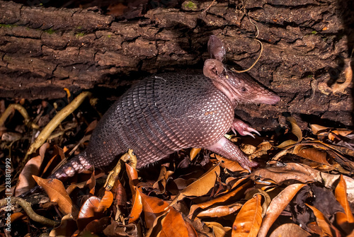 Nine banded armadillo photographed in Guarapari, Espirito Santo, Southeast of Brazil. Atlantic Forest Biome. Picture made in 2008.
