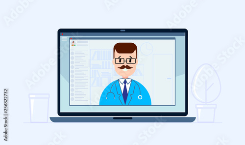 Online doctor consultation technology in laptop. Medical consultation concept in flat style. Doctor talking with patient. Vector