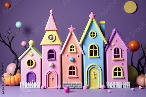 house, village, miniature, pastel, pink, purple, blue, orange, yellow, autumn, fall, cute, adorable, whimsical, charming, skittish, sweet, candy, pumpkin, greeting card, background, illustration, artwork, digital artwork, fantasy, fairy tale, magical, holiday, celebration, festive, october, decoration, design element