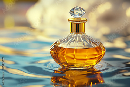 Perfume in a bottle. Perfume bottle against the background of water, close-up