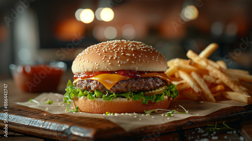 photo of a cheeseburger with lettuce, a package of French fries with sauce,