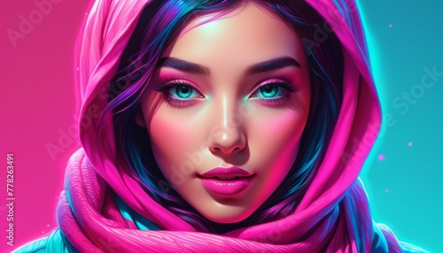 pink hair, blue eyes; she wears a pink scarf around her neck