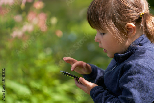 Portrait of a little girl playing on a smartphone in nature. Selective focus.
