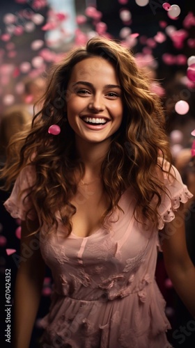 Portrait of Happy young girl in celebrates at a birthday party among confetti. AI generated
