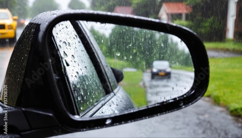 Rainsoaked side mirror on a car during a downpour