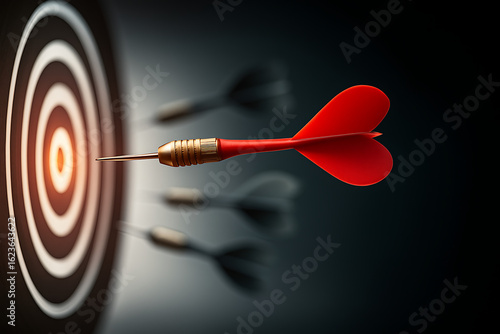 Red dart hitting bullseye target, precision accuracy concept, business strategy achievement, focus and success goal, leadership planning, motivation aim objective, competition challenge performance e