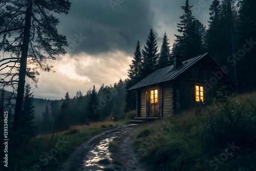landscape, mountain, house, forest, sky, tree, nature, tree, grass, mountain, summer, green, fog, pine, home, wood, cloud, rural, travel, view, bungalow, country, village, road, cabin