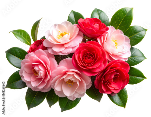 Romantic Camellia Corner Cluster with Soft Lighting and Foliage Accents, isolated on a transparent background.