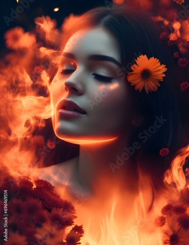 romantic girl surrounded by burning flowers and flames, a beautiful romantic scene