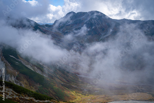 富山県立山町の立山の秋の紅葉の季節に登山している風景 Scenery of climbing Tateyama Mountain in Tateyama Town, Toyama Prefecture, Japan during the season of autumn leaves.