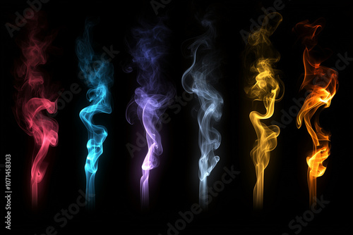 series of colorful smoke trails, each with a different hue. The smoke is thick and billowing, creating a sense of movement and energy. The colors of the smoke are vibrant and eye-catching