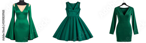 Set Emerald Green Party Dress with Cut-Out Sides Hanging on Velvet Hanger, Side Angle View, isolated on transparent background PNG