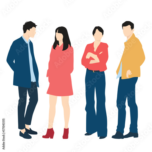 Set of young men and women, different colors, cartoon character, group of silhouettes of standing business people, students, the design concept of flat icon, isolated on white background