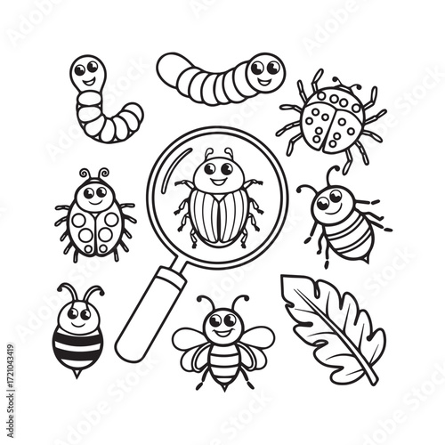 Smiling Forest Insects and Leaf Friends Under the Magnifying Glass Adventure Line Art.