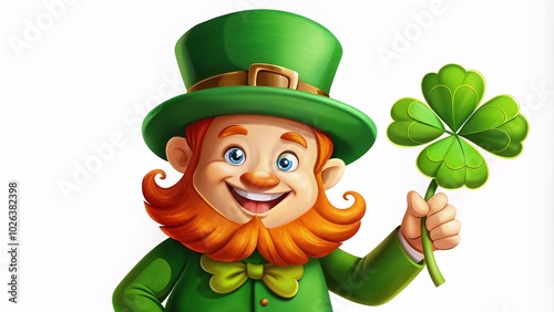 Smiling Leprechaun Holding Shamrock, Symbol of Luck and Irish Folklore