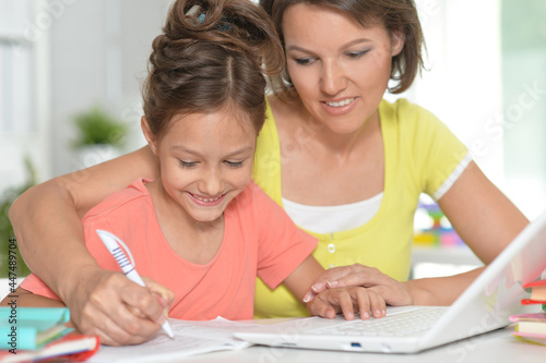 Smiling mother and daughter doing homework with help of laptop together