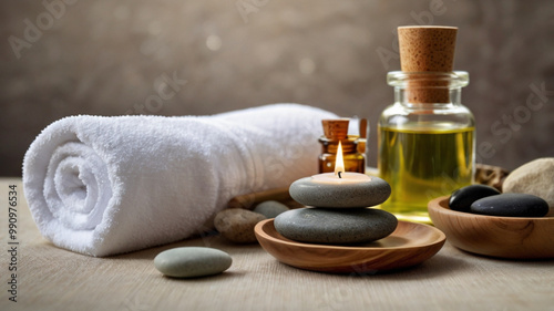 spa smooth stones, essential oils, and a lit candle, placed on a soft, white towel. The background should be blurred, with subtle greenery or bamboo elements peaceful ambiance.