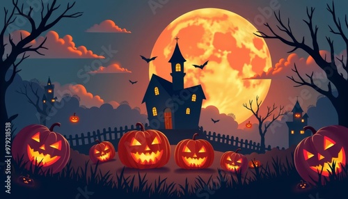 Spooky Halloween scene with jackolanterns and haunted house under full moon