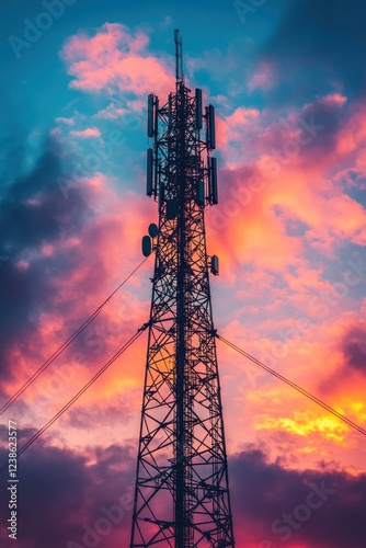 ** Stunning Communication Tower Silhouetted Against a Vibrant Sunset Sky with Dramatic Clouds..**