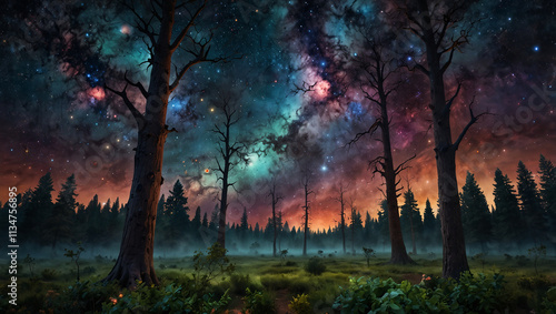 surreal cosmic landscapes featuring towering trees