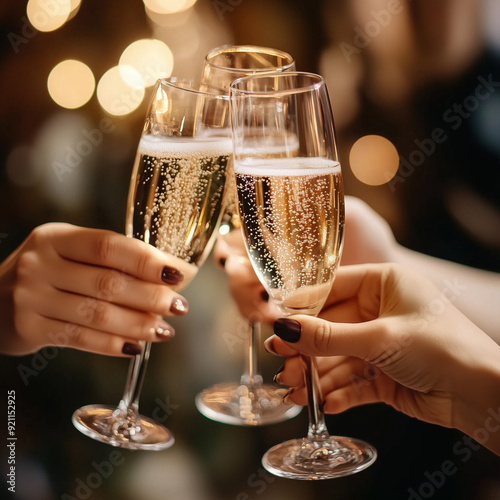three hands raising champagne flutes in a toast. The glasses are filled with a sparkling rosé champagne, creating a celebratory atmosphere, a group of people raising their glasses in a celebratory