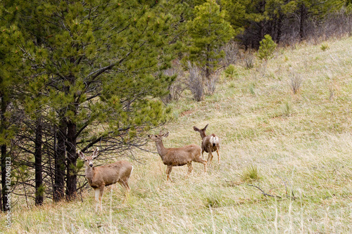 cervid, mule deer, animal, doe, herd, mammal, nature, three, trio, friends, companion, outdoors, wild animal, wildlife, beautiful, colorado, mountainous, national forest, park, fir-wood, pine tree, rocky, rocky mountain, rugged, tree, wilderness, season, seasonal, spring, springtime, mountain