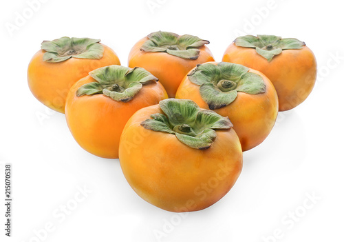 Tropical fruit persimmon. Kaki with leaves on white background.