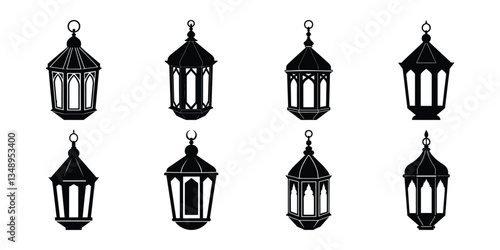 Vector Ramadan Arabian Islamic lanterns silhouettes set isolated on white background. Vintage lamps silhouettes.