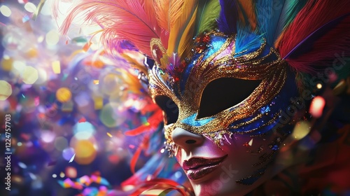 Vibrant carnival mask adorned with feathers and ribbons, set against a colorful background