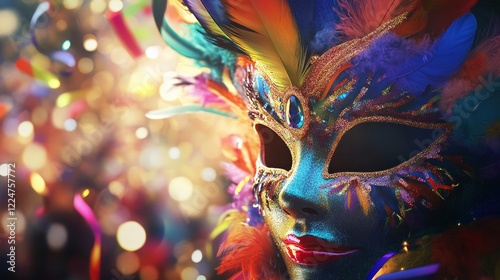 Vibrant carnival mask adorned with feathers and ribbons, set against a colorful background