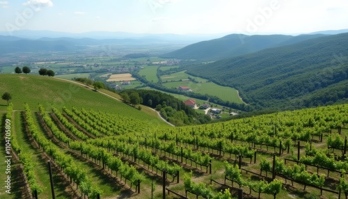 nature, day, cloud, blue, sunny, sky, field, vinery, hillside, scenic, landscape, pasture, agriculture, crop, green, rural, tree, mountain, countryside, vale