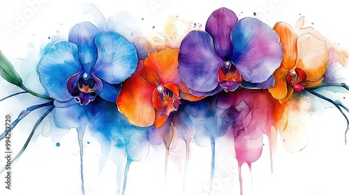 Watercolor painting of purple and orange flowers on a white background with a splash of paint at bottom