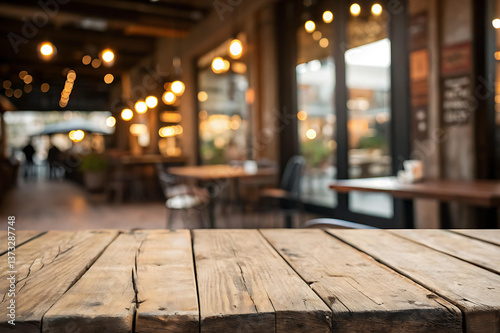 Wooden Table Top with Blurred Cafe Interior Background
