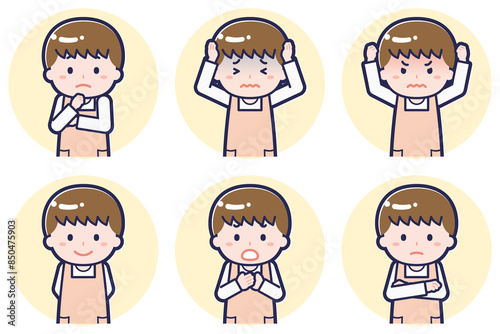 man, adult, occupation, nurse, teacher, kindergarten, apron, waist up, front, smile, joyful, fun, happy, positive, happy, enjoyment, positive, light, lively, sad, stern, depression, spicey, repentance, embarrassment, impatience, apprehension, anger, anger, moody, prayer, wish, expression, feeling, icon, pose, sweet, people, set