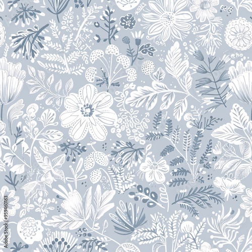 07250736 01. A seamless doodle botanicals pattern featuring intricate floral designs in a winter color palette of pale dusty blue and white