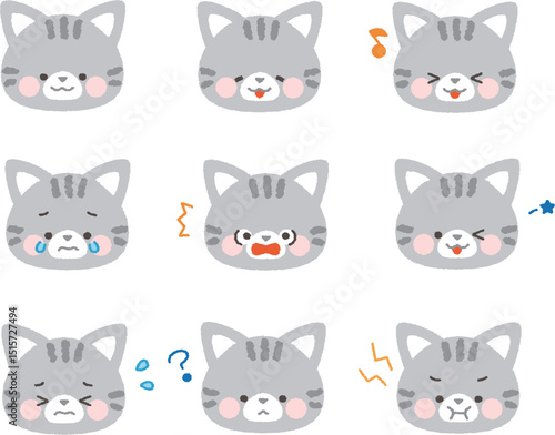sweet, cat, illustration, pretty, creature, animal, loose, smile, illustration, grey, icon, expression, emotion, cry, resent, problem, frightening, wink, joyful, rejoice, sad, surprised, vector, crayons, character, face