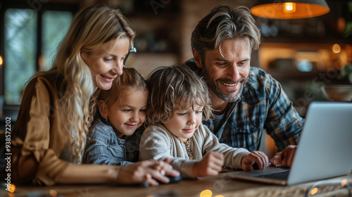 1 Family with kids doing their own activities, mom working on a laptop, dad playing with the kids