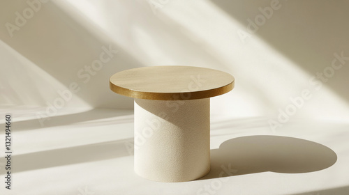 1. "Gold-topped White Cylindrical Podium Bathed in Soft Sunlight"