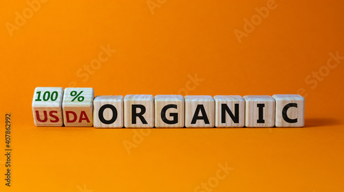 100 percent organic symbol. Fliped wooden cubes and changed words USDA organic to 100 percent organic. Beautiful orange background, copy space. Business, healthy lifestyle 100 percent organic concept.