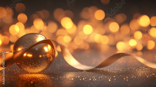 107.A rich and elegant 3D illustration showcasing a smooth gold ribbon intertwined with a glossy sphere. The setting is enhanced by glowing glitter details and a blurred background filled with warm