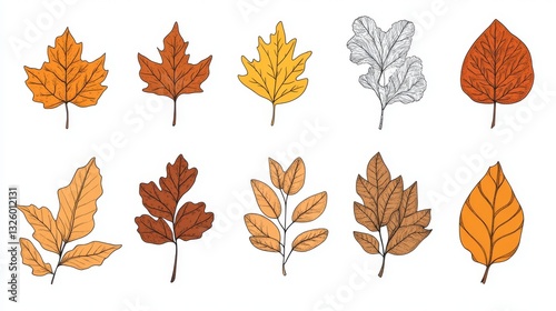 collection, autumn, leaf, including, maple, oak, birch, illustrated, intricate, doodle, detail, are, warm, tone, orange, yellow, brown, arranged, clean, white, background, versatility