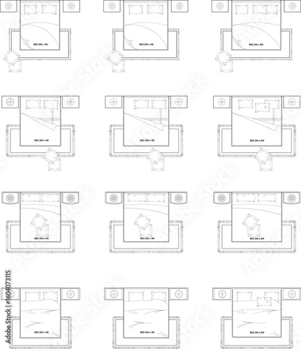 bed, bedchamber, topview, overhead, furniture, layout, interior design, home decor, sleeping, room, mattress, pillow, blanket, nightstand, rug, residential, home, apartment, design element, diagram, schematic, blueprint, line art, black-and-white, isolated, arrangement, cosy, comfort, domestic, master bedroom, template, graphic, simple, clean