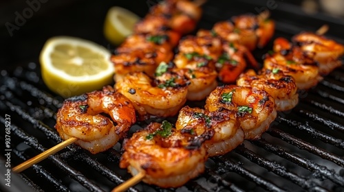 12. Juicy grilled shrimp skewers with a squeeze of lemon, glistening with marinade, outdoor grill setting
