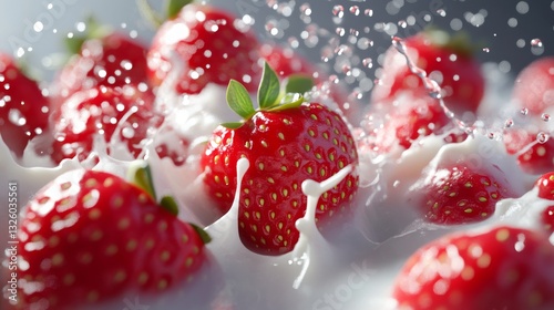 12.A dramatic 3D illustration of strawberries in motion, with splashes of milk and tiny droplets frozen in time. The composition emphasizes the freshness and juiciness of the fruit.