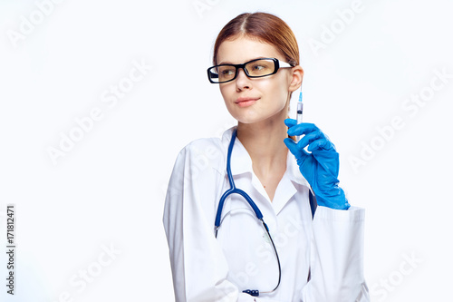 1477972 Young beautiful woman on white isolated background with glasses, doctor holding a syringe