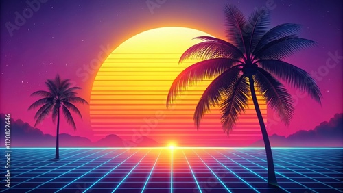 1980s retro style bright summer landscape background with coconut tree and sun, 80s, retro, vintage, summer, landscape